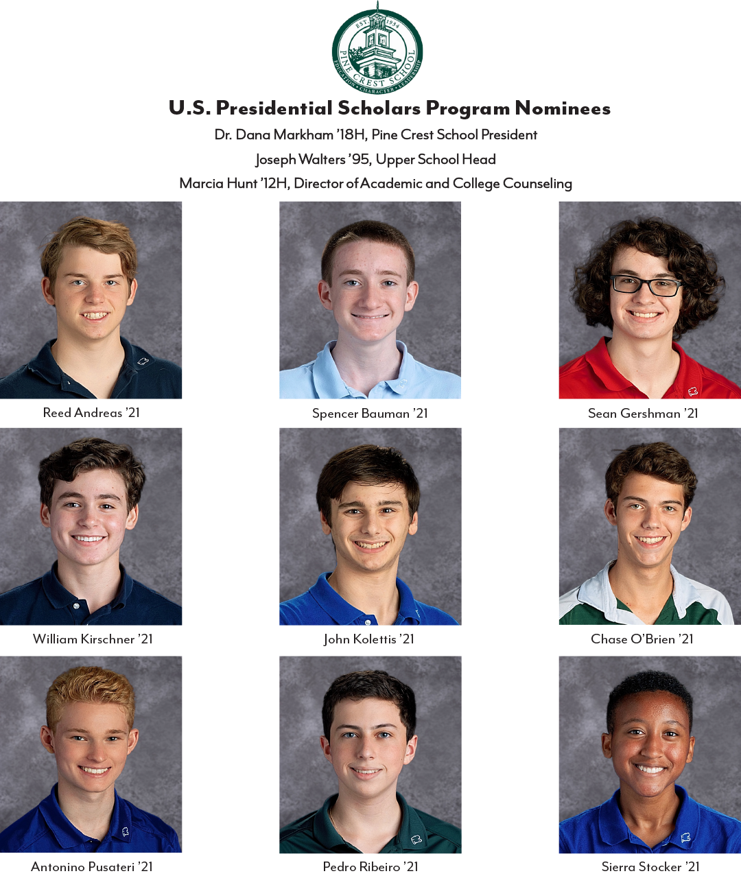 Nine (9) Pine Crest School seniors from the Class of 2021 have been nominated as candidates for the U.S. Presidential Scholars Program.
